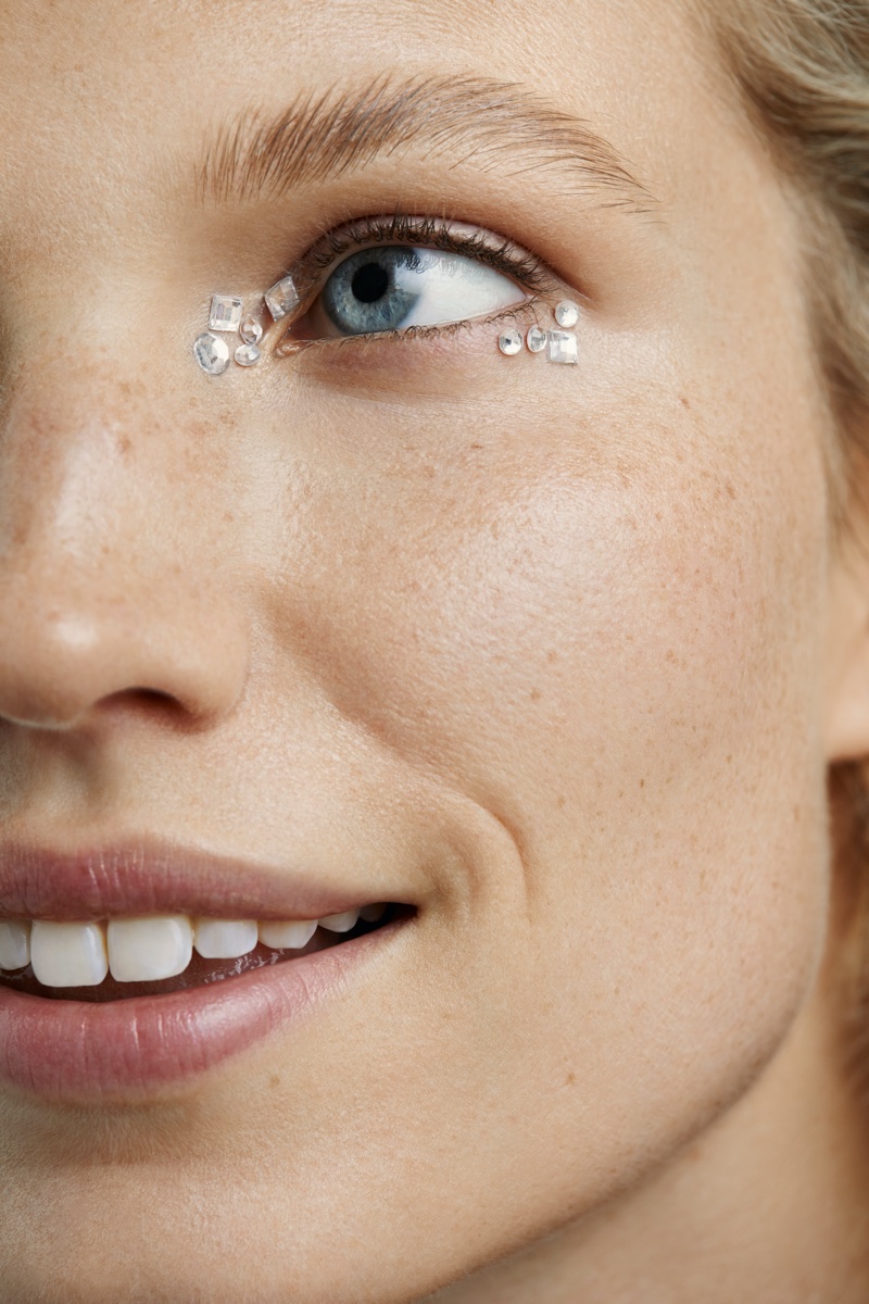 Photographer Per Florian Appelgren captures model Xanthe Wijma in a beauty editorial for L’Officiel Brazil’s February 2022 issue. The blonde appears in a spread that focuses on glittering and crystal-embellished makeup.