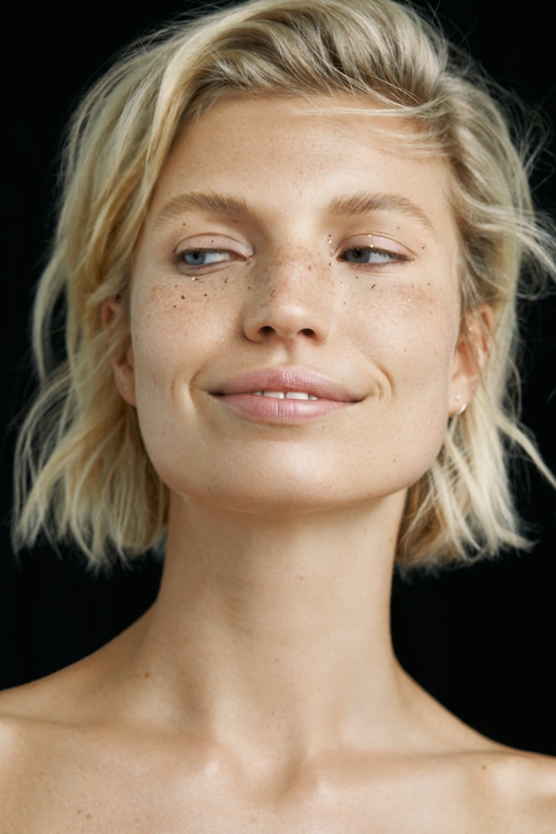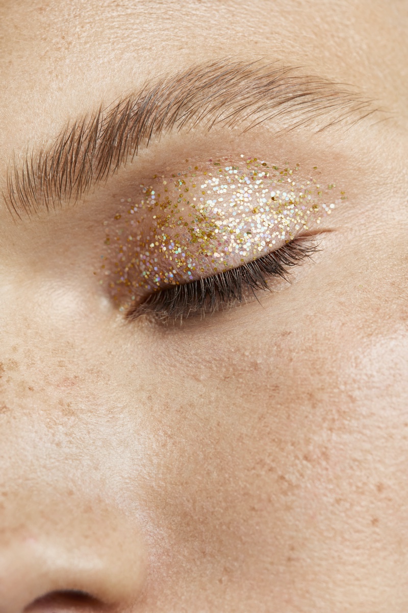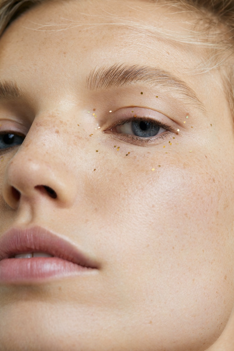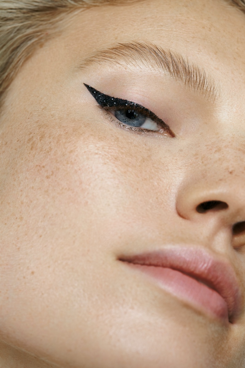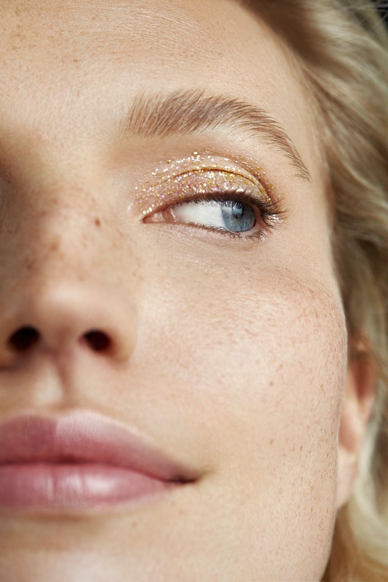 Hair and makeup artist Melanie Bulu works on her tousled tresses and dazzling skin. In addition to winged eyeliner and sequin embellishments, Xanthe’s natural freckles are showcased in the photos. Natalie Buskila also retouched the shoot.